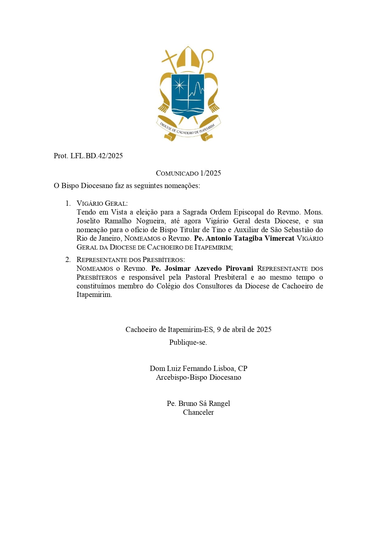 A Chancelaria da Diocese de Cachoeiro de Itapemirim tornou pública as determinações de Dom Luiz Fernando Lisboa, CP, Bispo Diocesano de Cachoeiro de Itapemirim, na tarde desta quarta-feira, 09 de abril, que nomeou o padre Antonio Tatagiba Vimercat, 64 anos, para o ofício de Vigário Geral da Diocese de Cachoeiro de Itapemirim. Antônio Tatagiba é Vigário Paroquial da Paróquia São Pedro, em Venda Nova do Imigrante e, até então, representante dos presbíteros e responsável pela Pastoral Presbiteral.