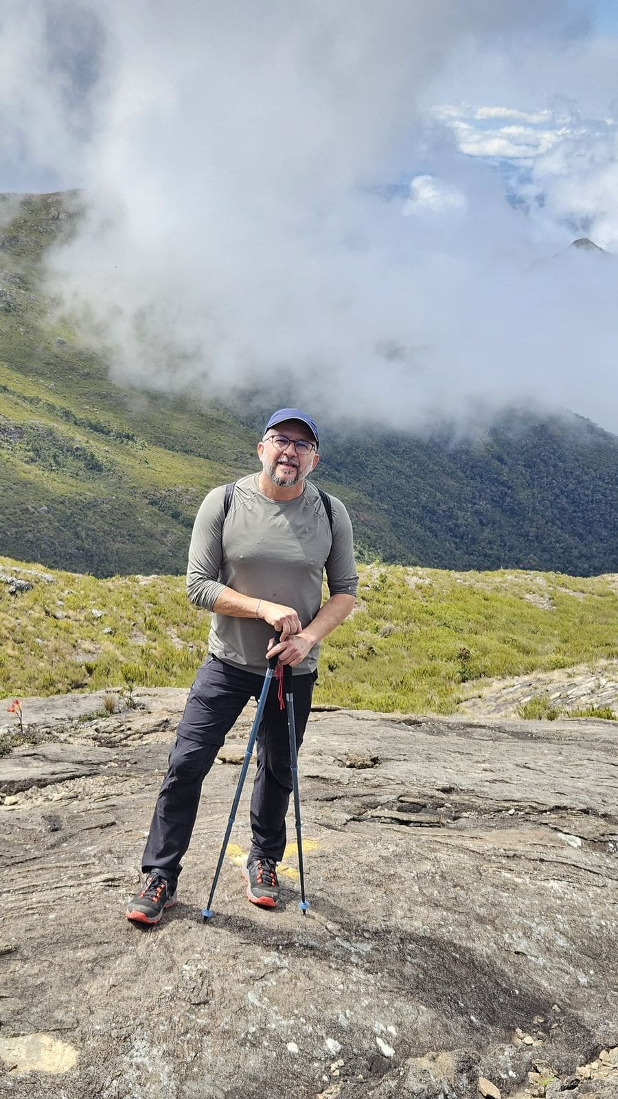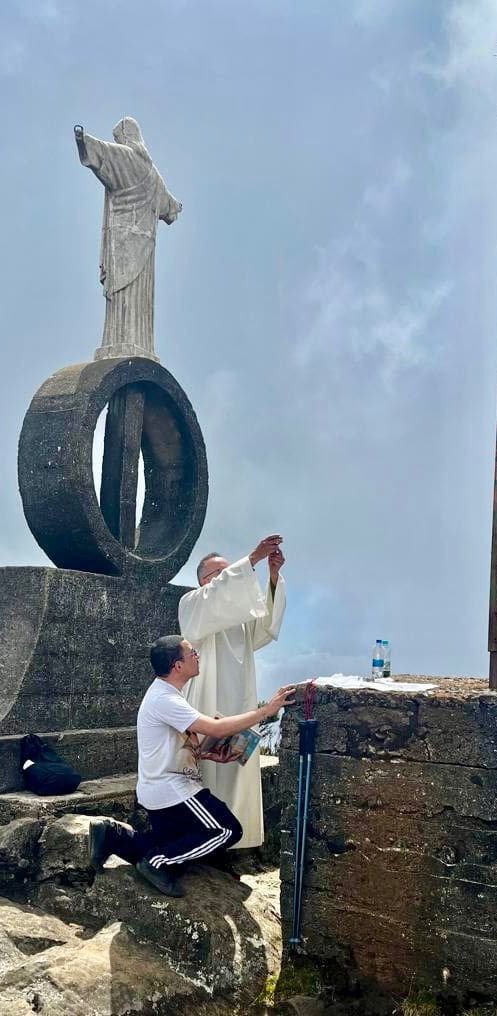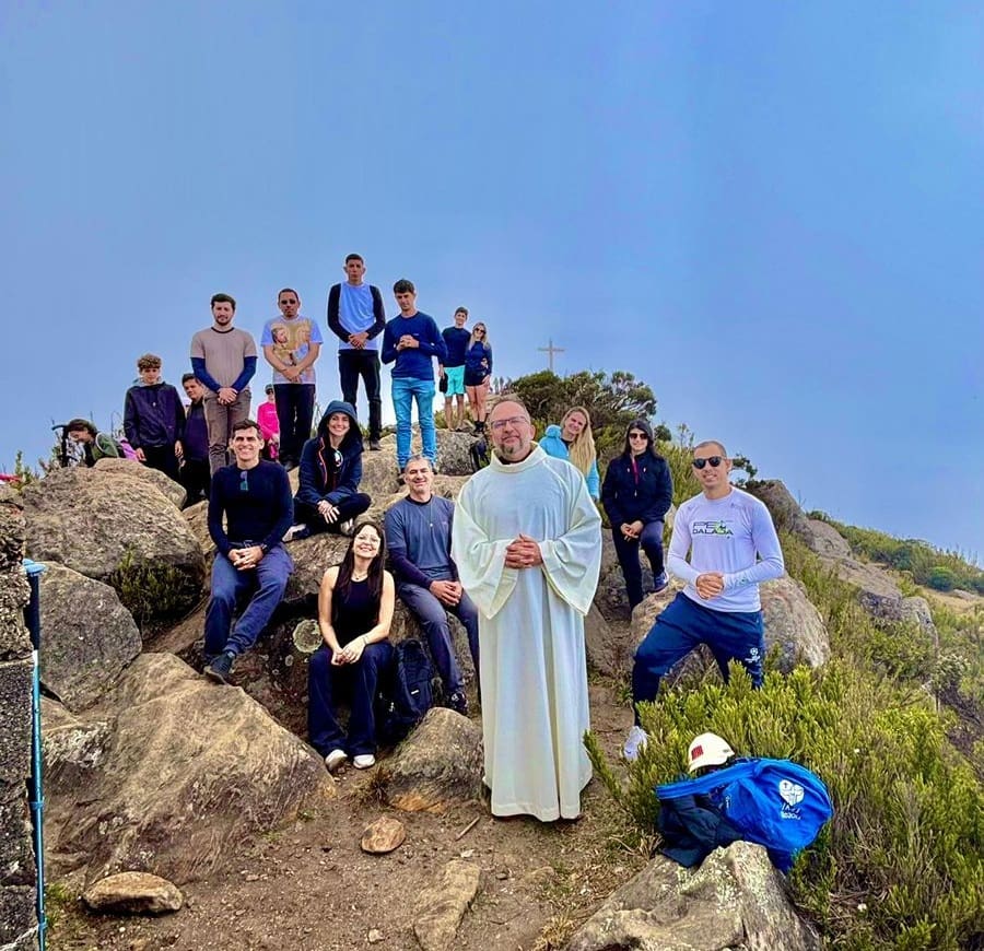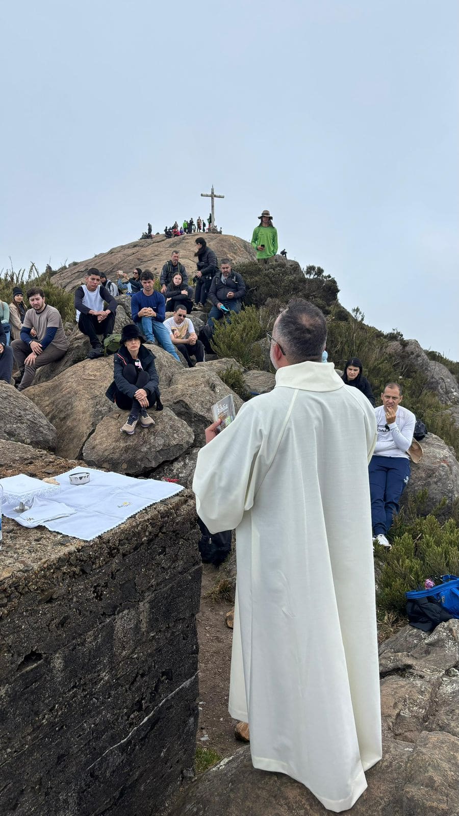 O padre Evaldo Praça Ferreira, 52 anos, ergueu um cálice na missa a mais de 2,8 mil metros acima do nível do mar no Pico da Bandeira, na região do caparaó, usando uma pedra como altar.