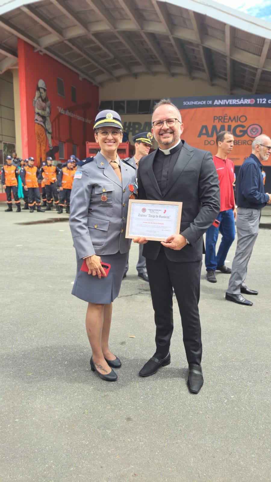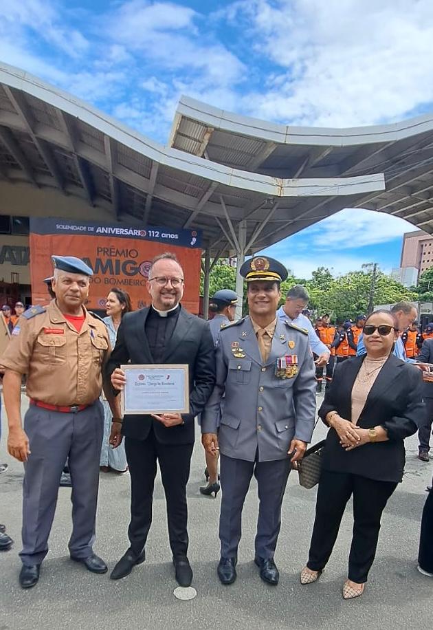 O Vigário Episcopal para Ação Social da Diocese de Cachoeiro de Itapemirim, padre Evaldo Praça Ferreira, recebeu, nessa terça-feira, 17 de dezembro, o diploma “Amigo do Bombeiro”. A honraria foi indicada pela subtenente Michelly Benincá Dias e entregue pelo subtenente do Corpo de Bombeiros Militar do Espírito Santo (CBMES), Edmundo Machado dos Santos, na sede do Primeiro Batalhão Bombeiro Militar (1º BBM), em Vitória.