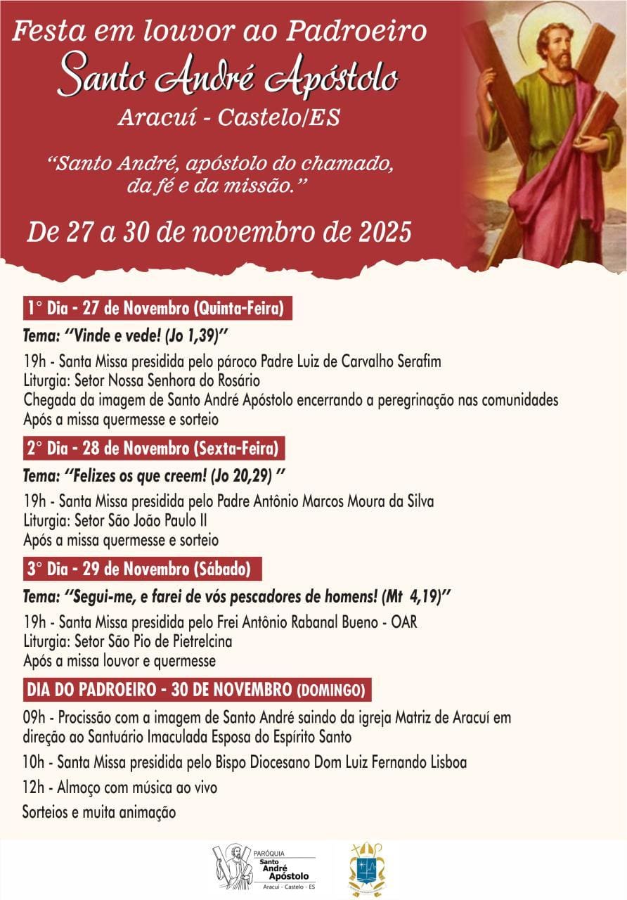 Os fiéis da Paróquia Santo André Apóstolo, em Aracuí, distrito de Castelo, vive dias de preparação para celebrar a tradicional festa em louvor ao padroeiro, que neste ano tem como tema “Santo André, apóstolo do chamado, da fé e da missão”.