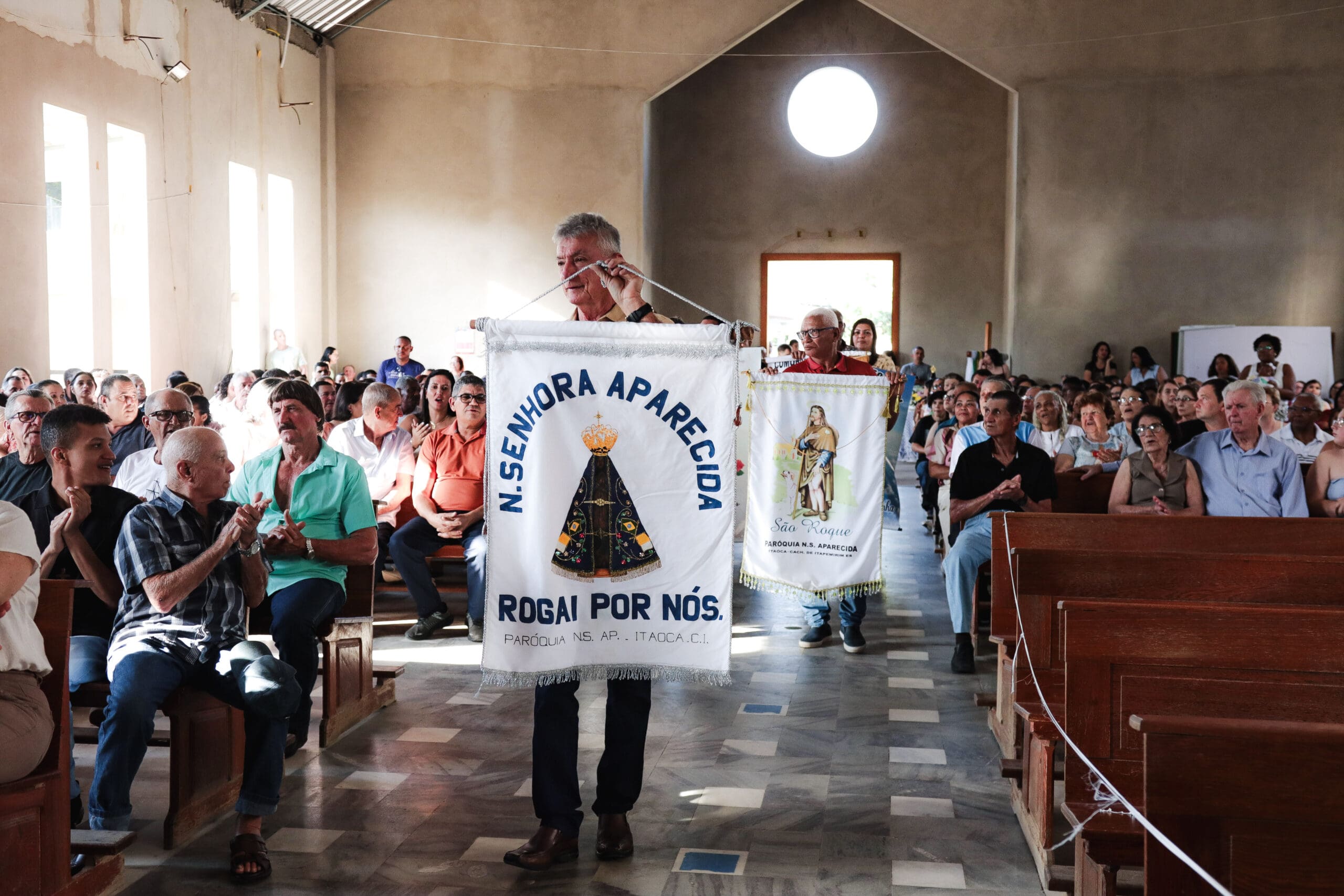 Logo na entrada da missa, um momento especial emocionou os presentes: representantes das dezenove comunidades participaram da procissão de abertura levando estandartes com as imagens de seus respectivos padroeiros, simbolizando a unidade e a diversidade da paróquia reunida em torno da Mãe Aparecida.
