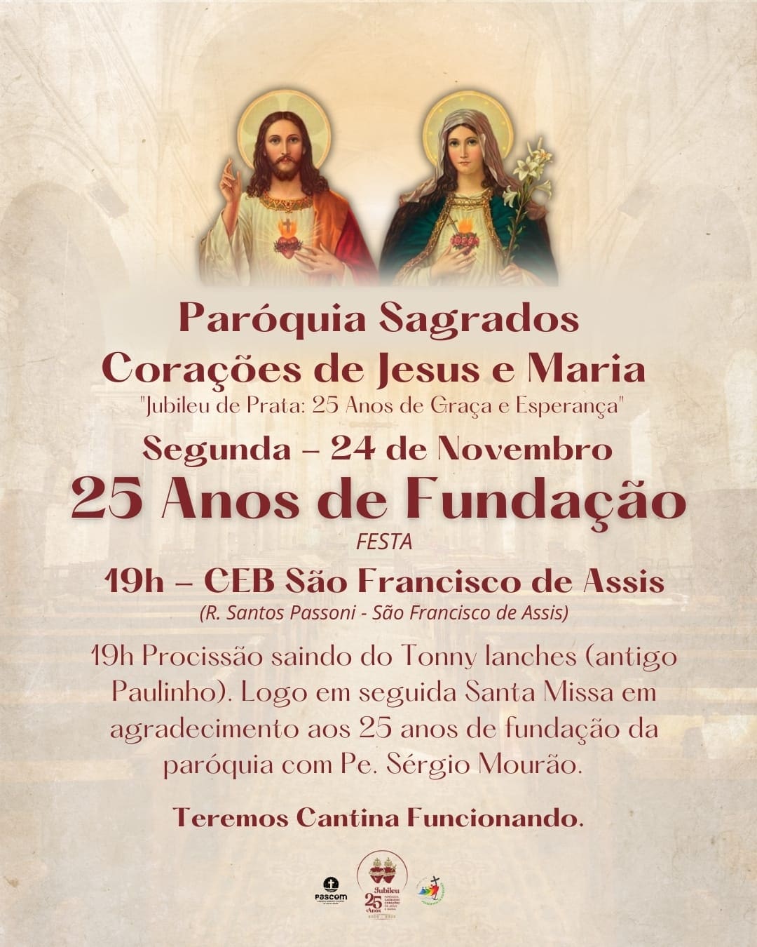 Hoje, ao celebrar o Jubileu de Prata, a Paróquia Sagrados Corações de Jesus e Maria reconhece com alegria os frutos dessa caminhada, construída com oração, sacrifício, dedicação e comunhão.