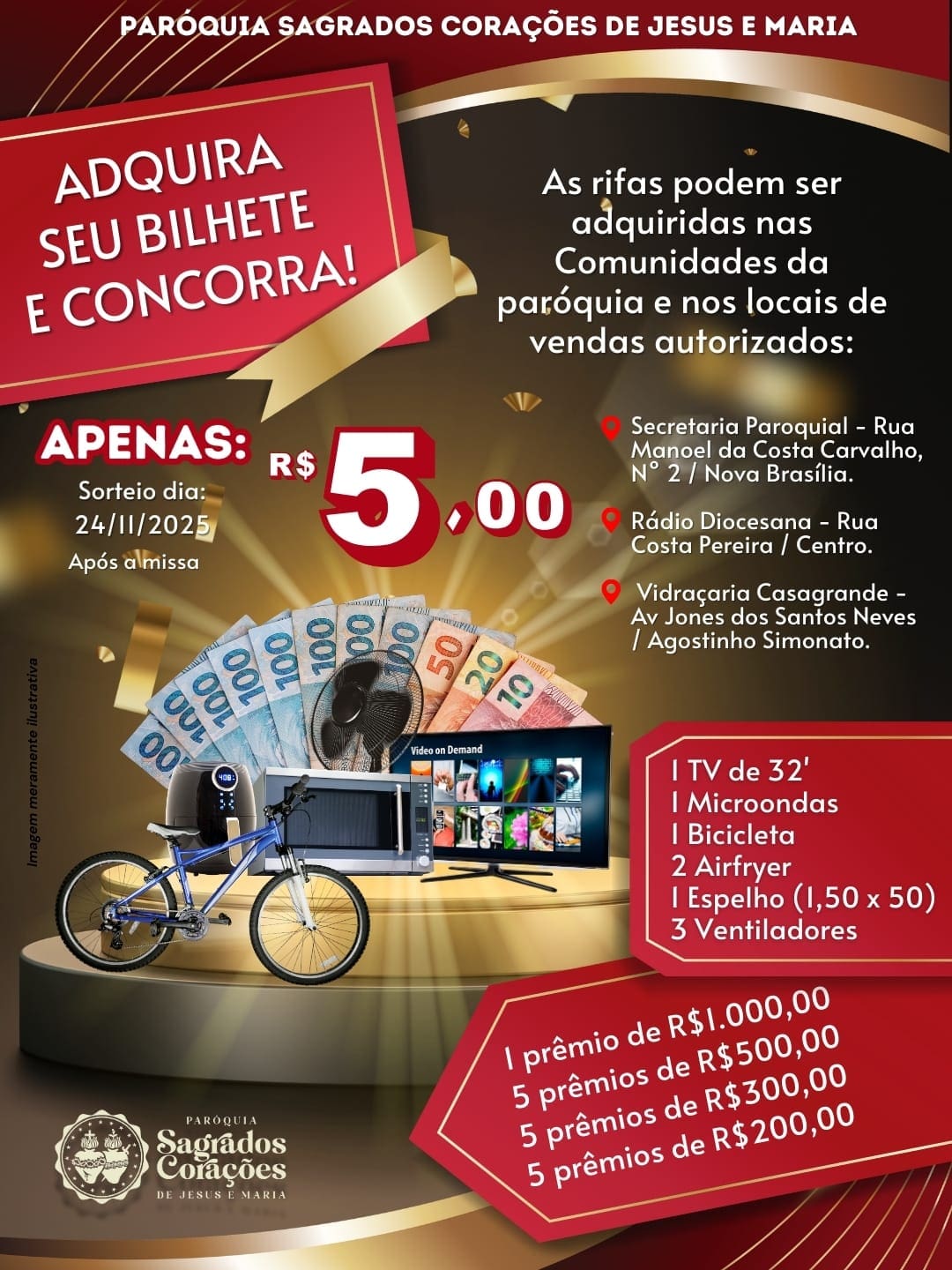 A rifa oferece prêmios variados, incluindo TV de 32 polegadas, bicicleta, micro-ondas, airfryer, espelho, ventiladores e valores em dinheiro que chegam a R$ 1.000,00. Cada bilhete custa R$ 5,00, e o sorteio acontecerá no dia 24 de novembro de 2025, logo após a Santa Missa.