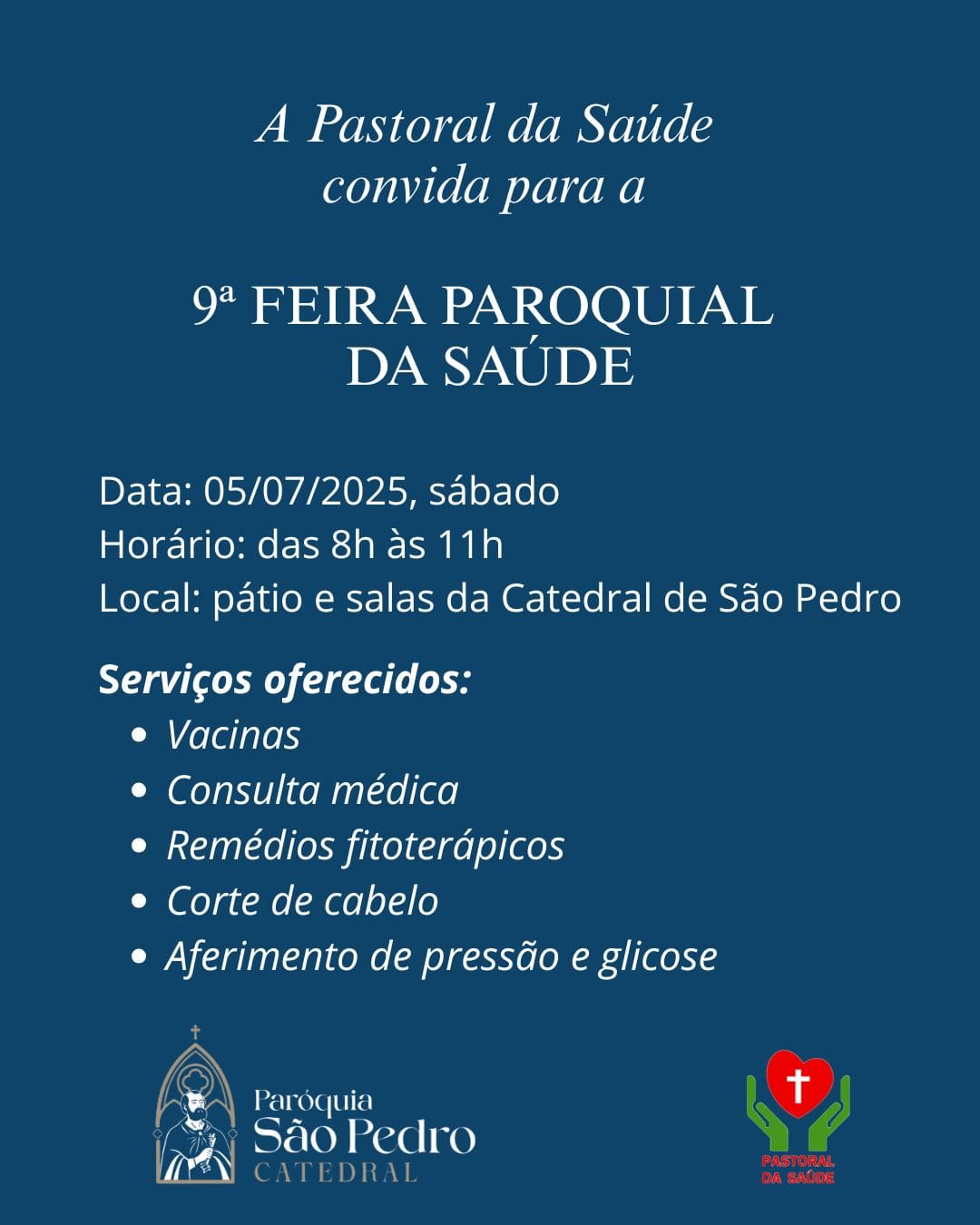 A Pastoral da Saúde da Paróquia São Pedro (Catedral), em Cachoeiro de Itapemirim, convida toda a comunidade para participar da 9ª Feira Paroquial da Saúde, que acontecerá neste sábado, dia 5 de julho, das 8h às 11h, no pátio e nas salas da Catedral de São Pedro.