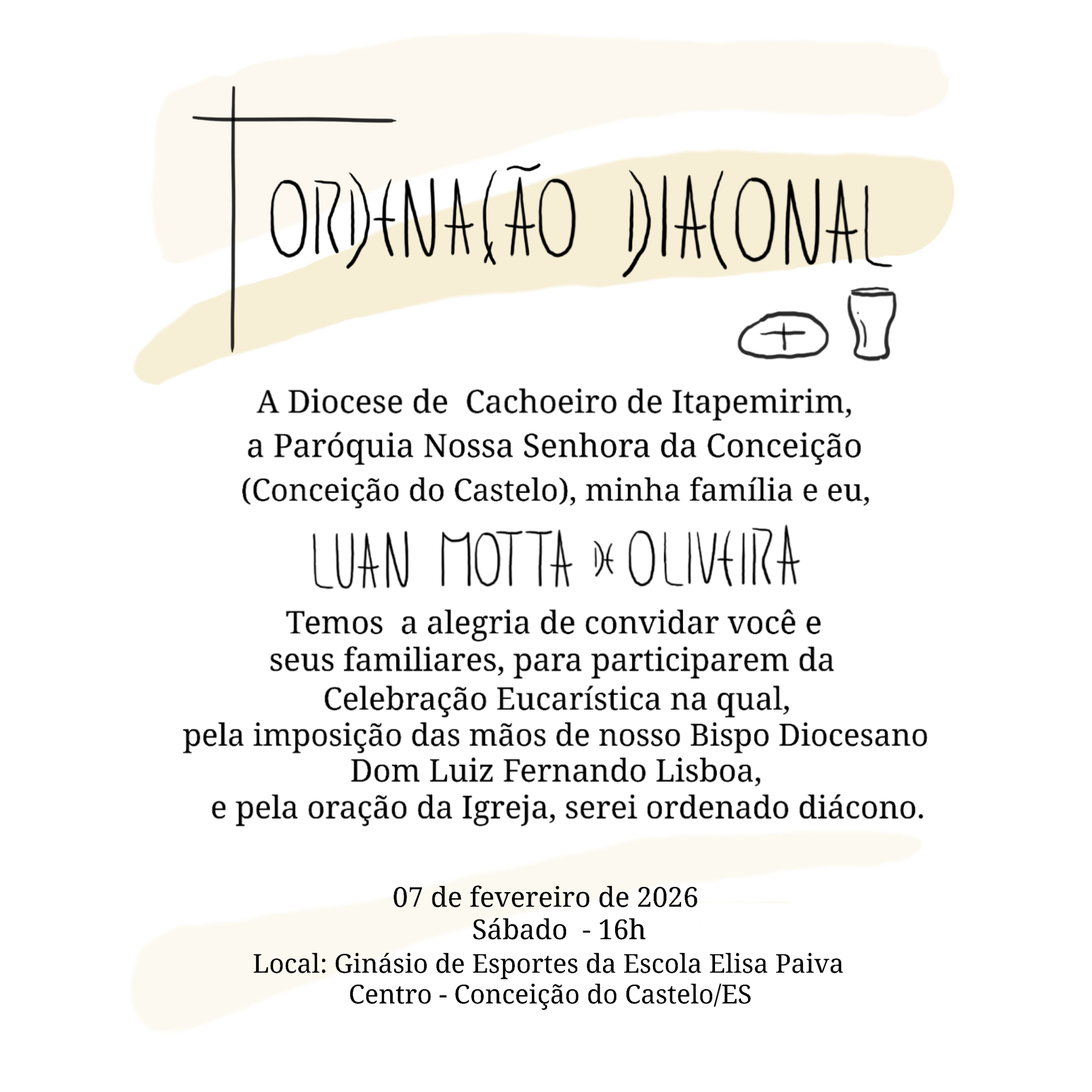 A Diocese viverá, no dia 07 de fevereiro de 2026, um momento especial de fé e comunhão com a Ordenação Diaconal do seminarista Luan Motta de Oliveira. A celebração acontecerá às 16h, no Ginásio de Esportes da Escola Elisa Paiva, no Centro de Conceição do Castelo, e marcará uma etapa fundamental no caminho vocacional do jovem seminarista rumo ao ministério ordenado.