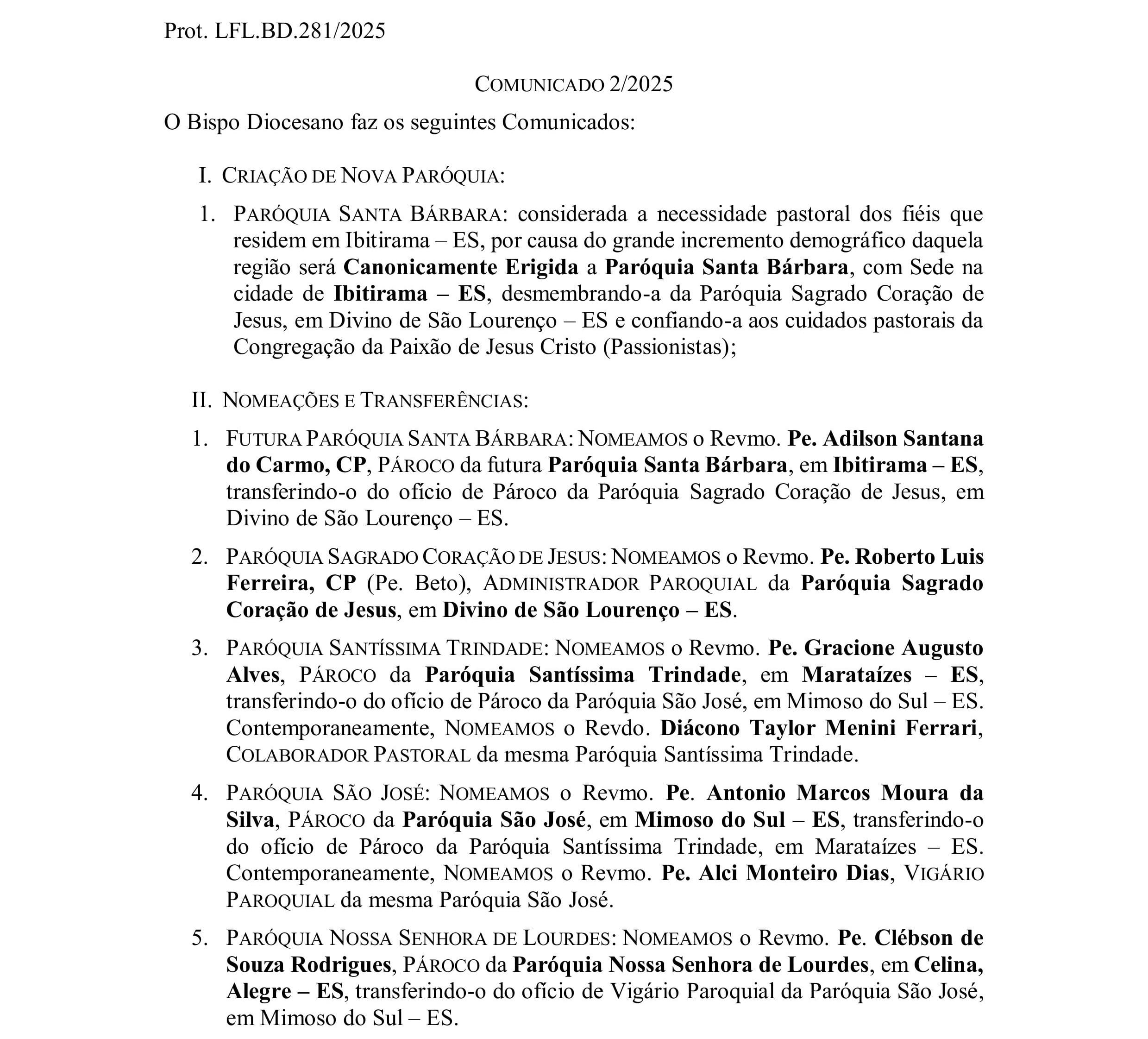 3 dezembro 2025 Diocese anuncia criação de nova paróquia e realiza nomeações e transferências de presbíteros