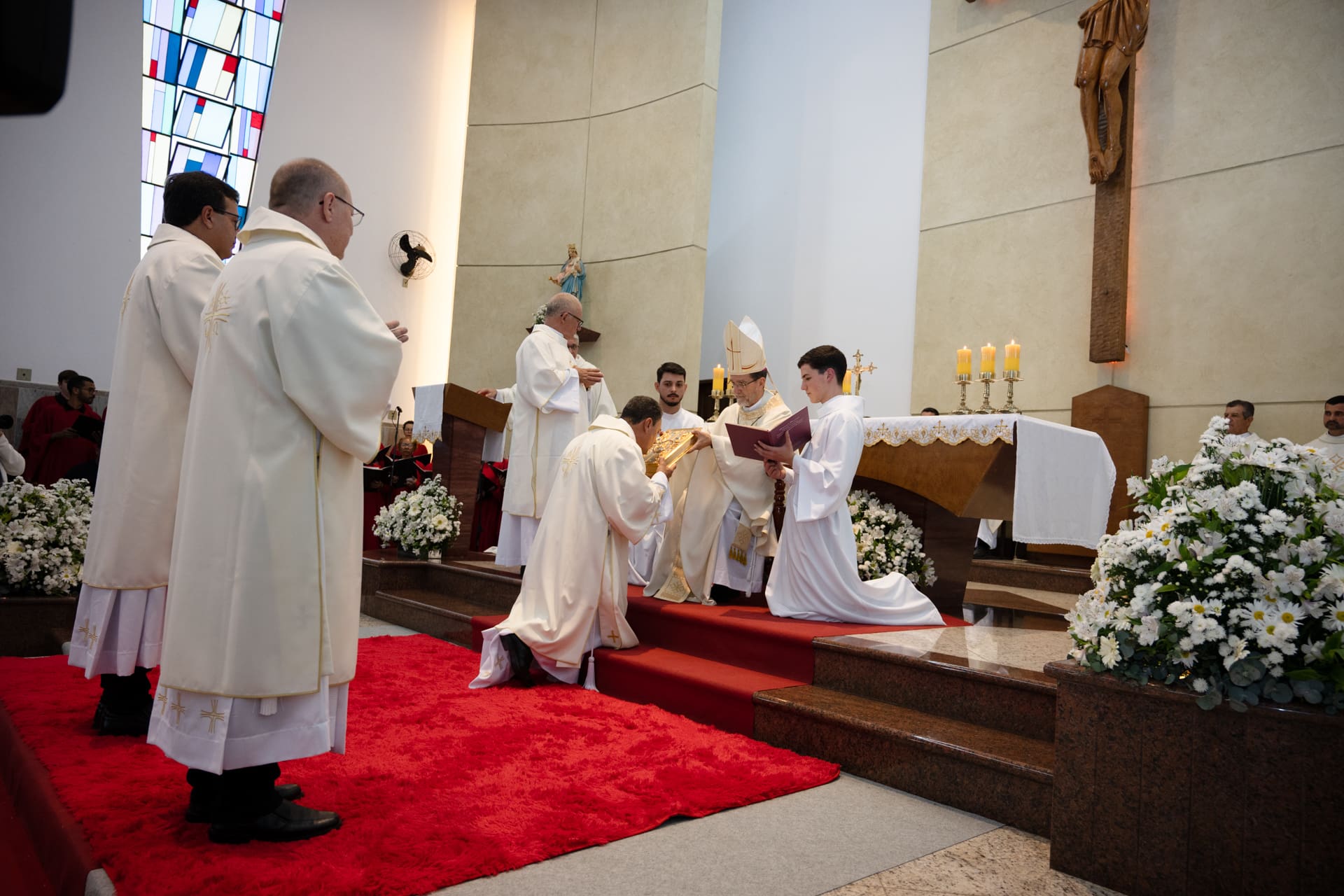 Marcos se apresentou no último sábado, 23, diante do altar do Senhor, consagrando sua vida ao ministério diaconal sob o lema retirado do Salmo 40,9, que expressa com clareza a disposição do seu coração: “Tenho prazer em fazer a tua vontade, ó meu Deus! Tua lei está dentro do meu coração.”
