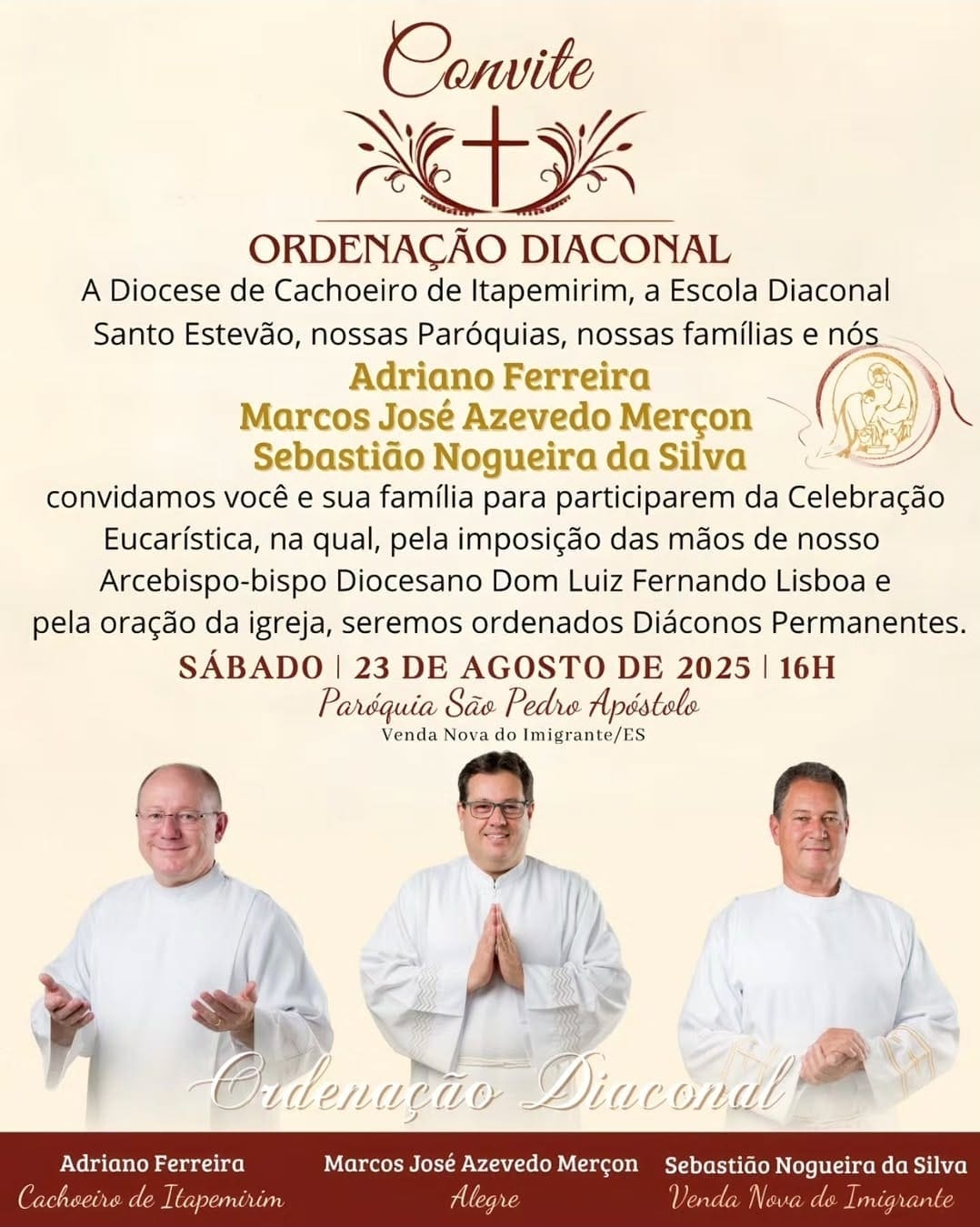 “A Diocese de Cachoeiro de Itapemirim convida todas as comunidades paroquiais, pastorais, movimentos, amigos e familiares a participarem desta solene celebração. Que possamos nos unir em oração por Adriano, Marcos José e Sebastião, pedindo a Deus que os fortaleça na missão e os conduza com sabedoria, humildade e zelo pastoral”, diz um trecho do documento.
