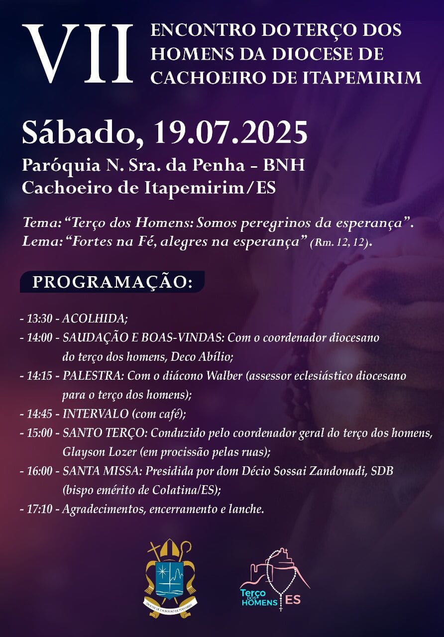 No próximo sábado, dia 19 de julho, acontece na Paróquia Nossa Senhora da Penha, no bairro BNH, em Cachoeiro de Itapemirim/ES, um importante momento de fé e unidade: o VII Encontro Diocesano do Terço dos Homens. O evento reunirá representantes de diversas paróquias da Diocese em uma tarde de espiritualidade, oração e confraternização.